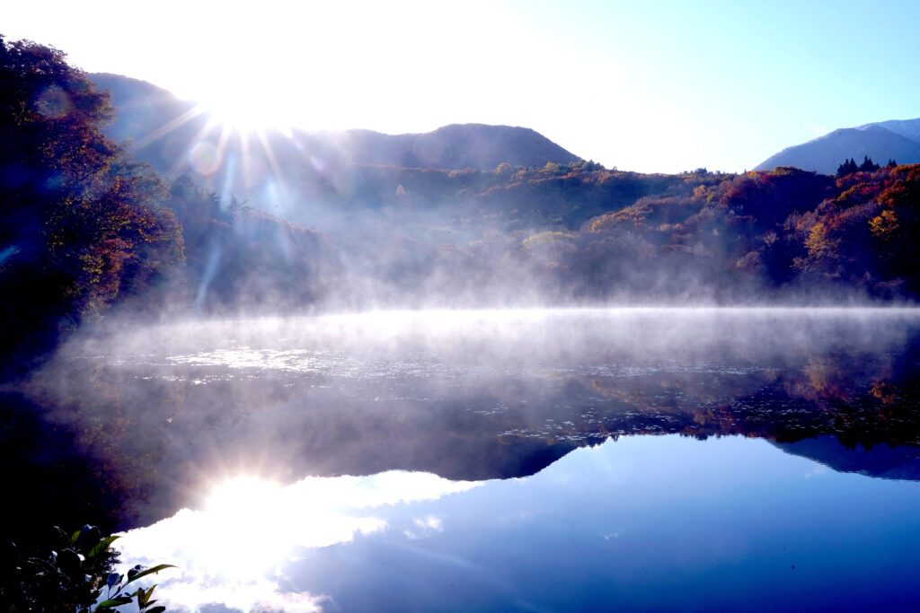 気温が低く「気嵐」が立上り、無風だったので水鏡写真の撮影には最高のコンディションでした