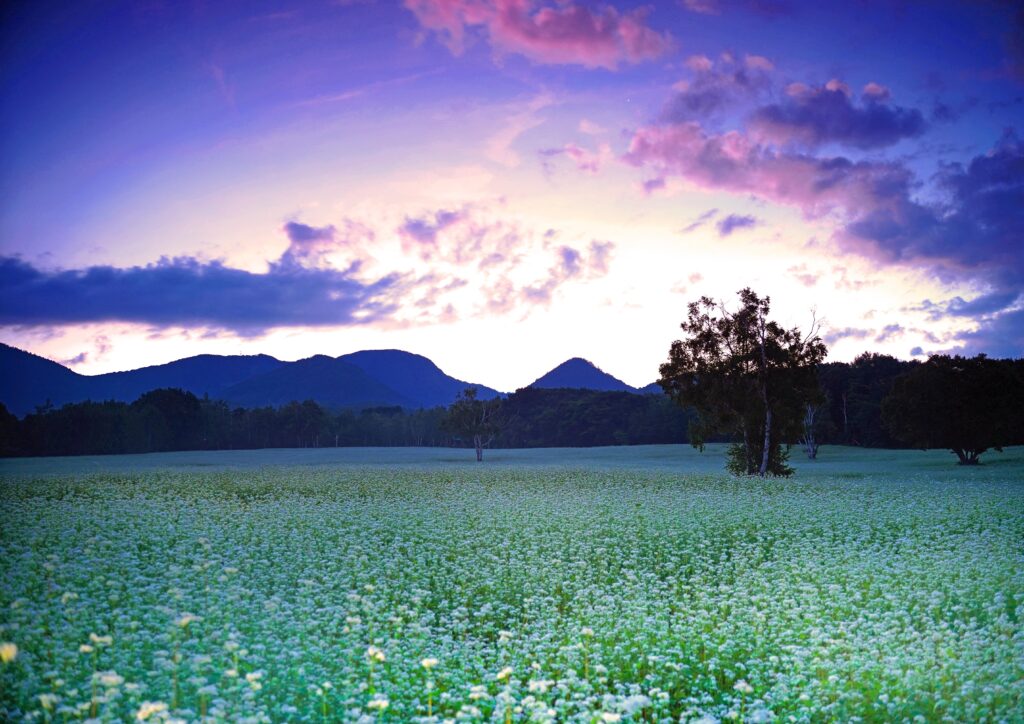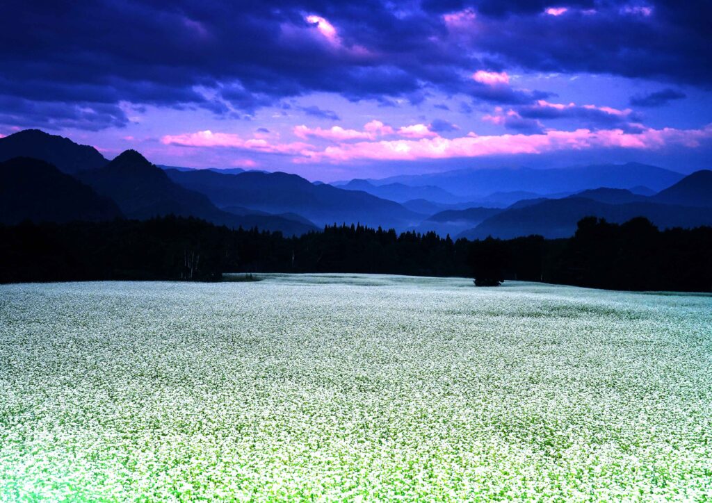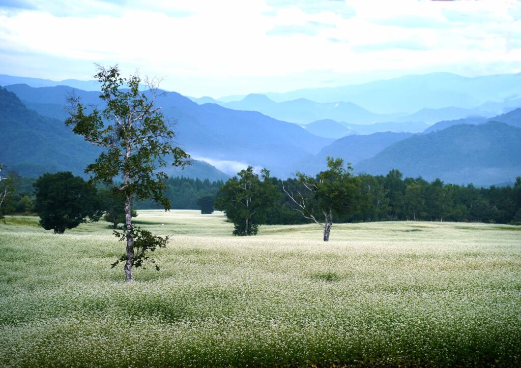 高杖のソバ畑は約12 haと広大な上傾斜地で、奥行き感が表現できれば最高です